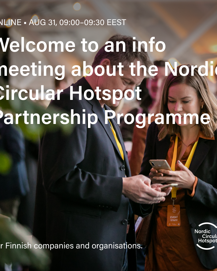 Blog 01/11/2023Circular Design Success Story – Aito Support Blog 30/10/2023Jotta voi raportoida täytyy ensin toimia: Corporate Sustainability Reporting Directive NewsOther 23/10/2023National Circular Design Programme: final event 12th Dec – join us! News 18/10/2023Launch: Nordic Roadmap for Circular Financing — paving the way for sustainable business News 05/10/2023Nordic Circular Summit 2023 is approaching Blog 15/09/2023Monialaisella yhteistyöllä luodaan uudistavia kiertotalouden mukaisia rakennettuja ympäristöjä News 17/08/2023Tell me more about the Partnership programme! News 15/06/2023Tervetuloa uudistavan liiketoiminnan maailmaan!